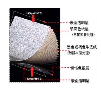 抗倍特板是由装饰色纸含浸三聚氰胺树脂,加上多层黑色或褐牛皮纸含浸酚醛树脂层叠后,再用钢板经由高温(150℃)高压(1430psi)的环境压制而成,厚度从1.6mm到25mm皆可制作。它是一种透心结构的高压装饰板,表面的色纸层,不但可满足多种花色选择,还可提供“亮面、珍珠绒面、微星面、菱格纹、方格纹、飞雪流星”的装饰需求。